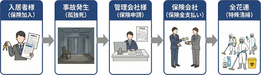 万が一の際は、その保険金を使って全花連が「解約手続き」「残置物撤去」「特殊清掃」「原状回復(消臭)」までワンストップで行います。